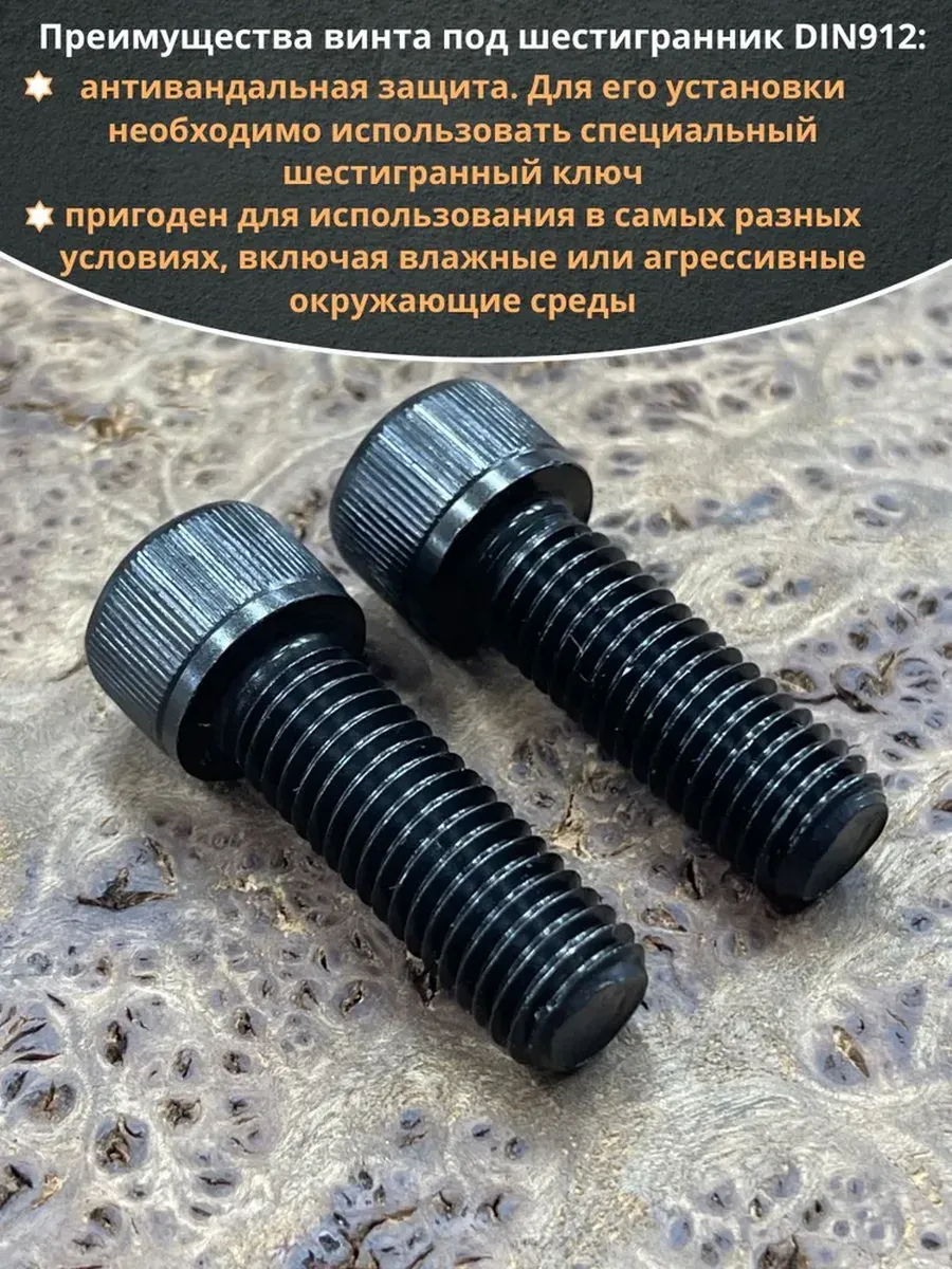 Винт имеет высокую цилиндрическую головку, предназначен для установки его с углублением в отверстие. Закручивается винт при помощи ключа-шестигранника. Высокопрочный винт DIN 912 обеспечивает надежное скрепление узлов и деталей в монтажных и других видах работ. Он имеет головку цилиндрической формы с углублением под соответствующий шестигранный ключ.