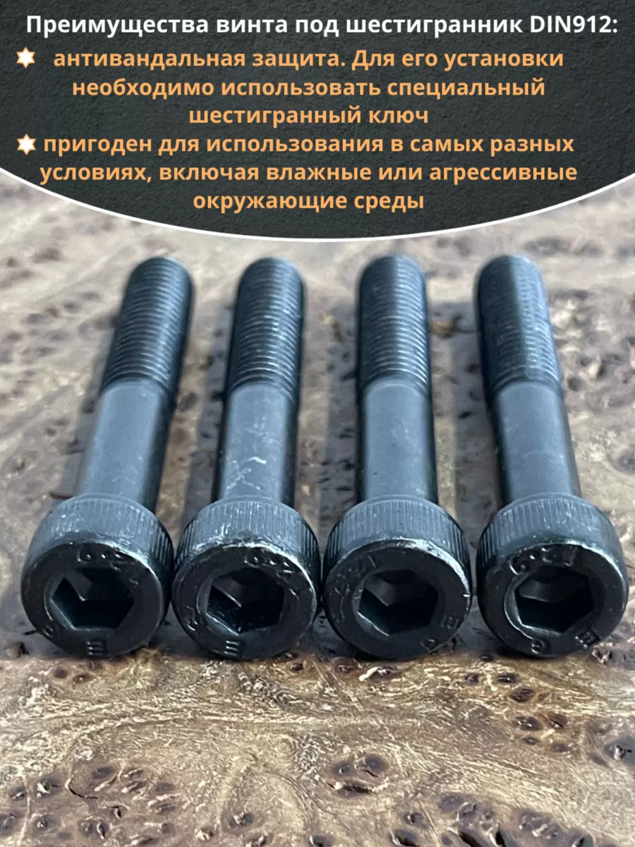 Винт имеет высокую цилиндрическую головку, предназначен для установки его с углублением в отверстие. Закручивается винт при помощи ключа-шестигранника. Высокопрочный винт DIN 912 обеспечивает надежное скрепление узлов и деталей в монтажных и других видах работ. Он имеет головку цилиндрической формы с углублением под соответствующий шестигранный ключ.