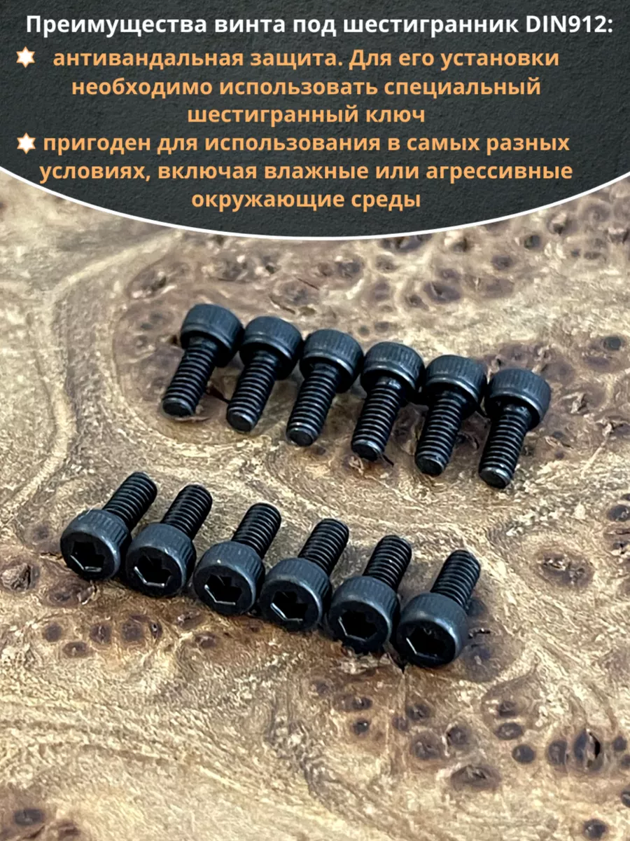 Винт имеет высокую цилиндрическую головку, предназначен для установки его с углублением в отверстие. Закручивается винт при помощи ключа-шестигранника. Высокопрочный винт DIN 912 обеспечивает надежное скрепление узлов и деталей в монтажных и других видах работ. Он имеет головку цилиндрической формы с углублением под соответствующий шестигранный ключ.