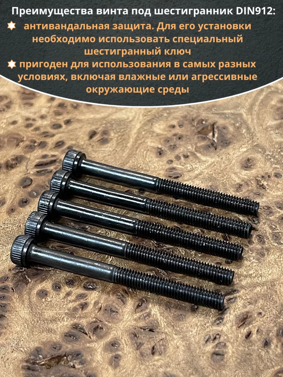 Винт имеет высокую цилиндрическую головку, предназначен для установки его с углублением в отверстие. Закручивается винт при помощи ключа-шестигранника. Высокопрочный винт DIN 912 обеспечивает надежное скрепление узлов и деталей в монтажных и других видах работ. Он имеет головку цилиндрической формы с углублением под соответствующий шестигранный ключ.