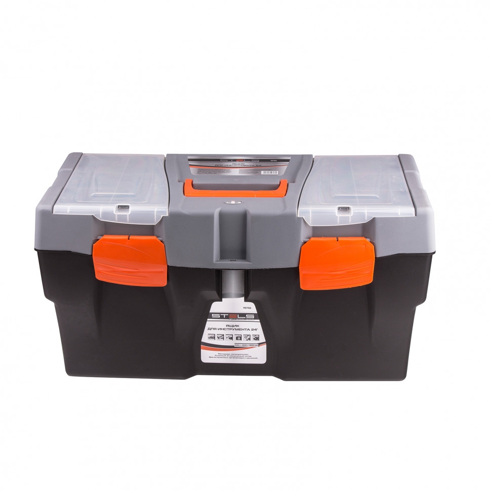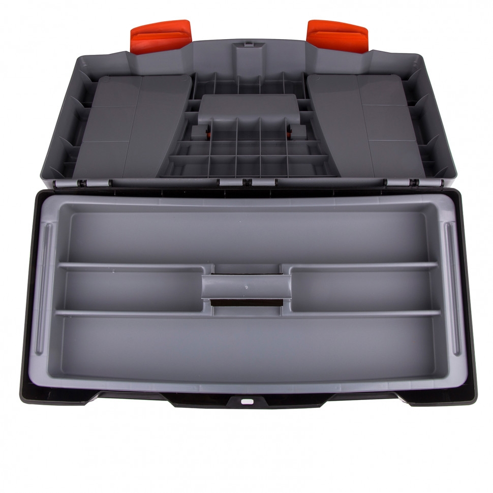 Инструментальный ящик с дополнительными секциями.Ящик размером 59 х 30 х 30 см (24") изготовлен из полипропилена, имеет два встроенных органайзера с крышкой и съемный 3-х секционный лоток. Предназначен для хранения и транспортировки инструмента, расходных материалов и крепежных изделий, а также любых сходных по габаритам бытовых товаров.