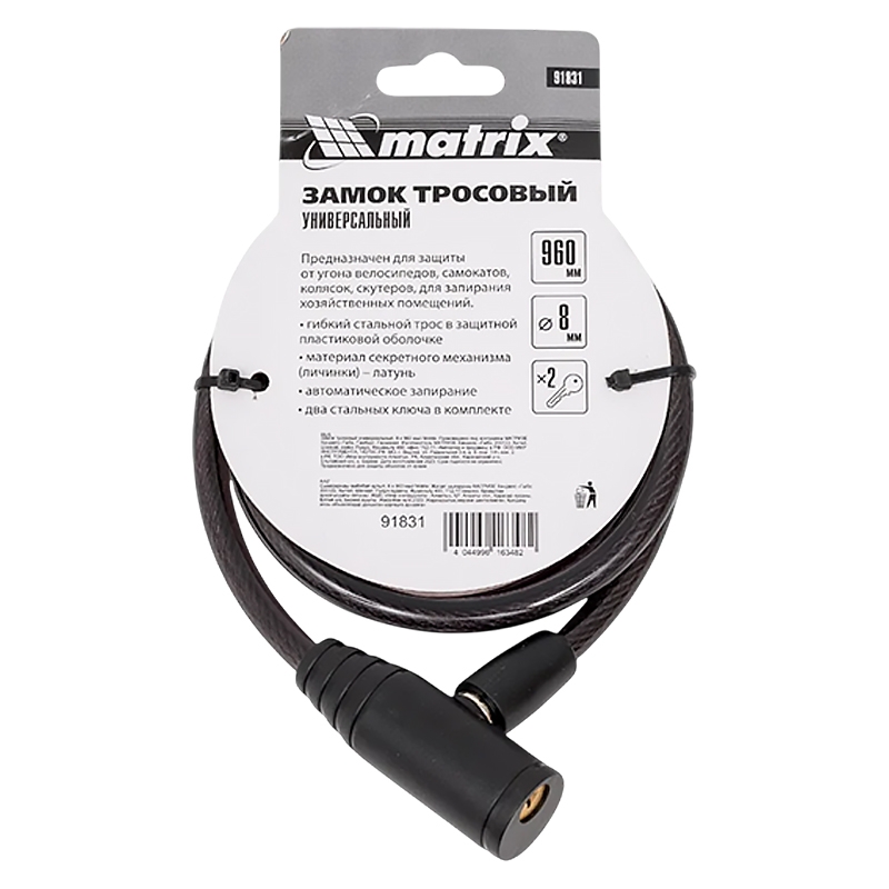 Замок тросовый предназначен для обеспечения сохранности велосипедов, детских колясок, санок, мототехники и т.д., а так же для запирания хозяйственных помещений. Длина троса 960 мм. Гибкий стальной трос в защитной пластиковой оболочке, диаметром 8мм. Материал секретного механизма (личинки) - латунь. Автоматическое запирание. В комплекте два стальных ключа.